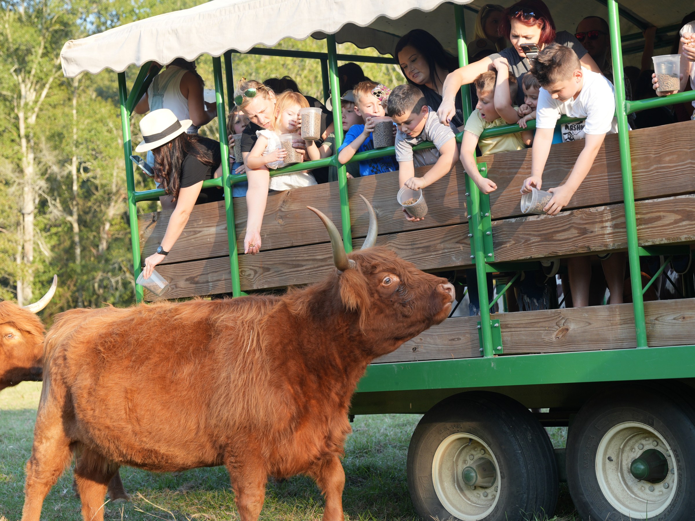 Our Safari Wagon Adventure is the ultimate way to witness the beauty of exotic and native species in a natural, spacious setting. This guided tour takes you through rolling pastures and shaded woodlands along the scenic Comite River, where you’ll see herds of grazing animals, playful capybaras, and towering bison—all while learning fascinating facts from our knowledgeable guides. Want to make it even more unforgettable? Opt for a feed bucket and watch as friendly creatures approach your wagon for a snack, offering incredible photo opportunities and unforgettable moments.